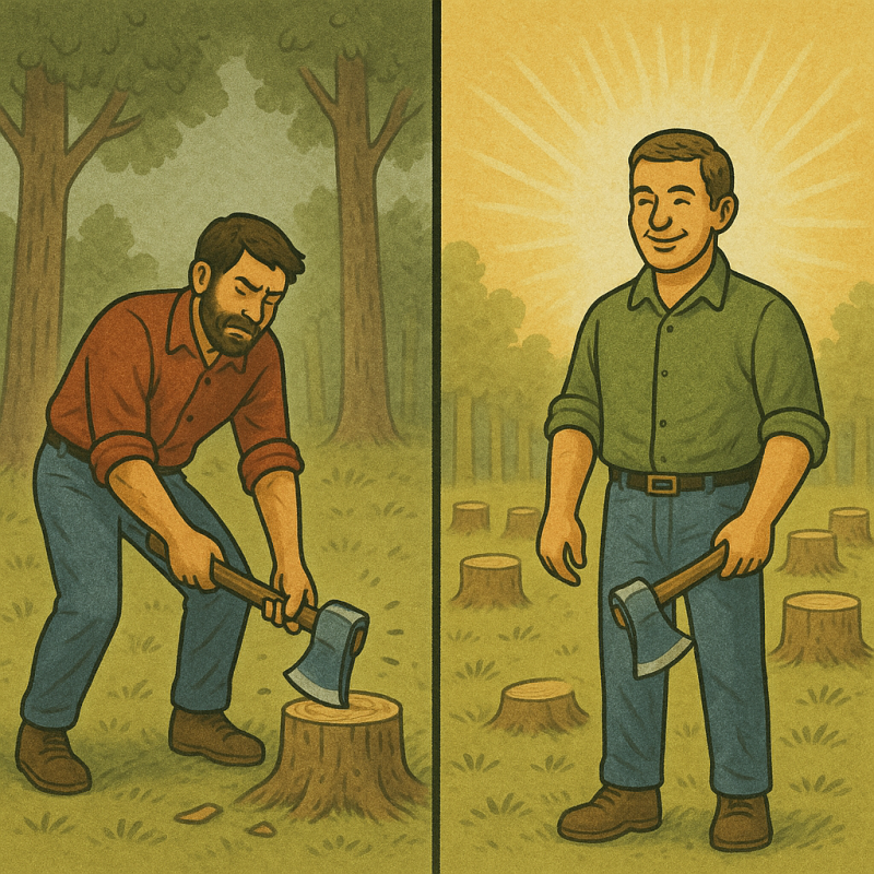 दो लकड़हारों ने अपनी कुल्हाड़ियों का इस्तेमाल एक ही महारत के साथ किया, लेकिन अलग-अलग तरीकों से: